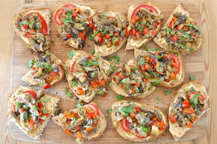 Heat the olive oil in a large pan and add onions and garlic. Cook until lightly softened and add the spices. Cut the eggplant and red pepper in small cubes and add to the pan. Add about 1/2 cup of water, so it doesn’t burn and cook on medium heat until everything is softened (like on the picture). Adding some water if needed. This might take about 20-30 minutes. Add salt to your liking and let cool down a bit. Meanwhile prepare the bread slices. Spread some peanut butter on it and lay thin slices of tomato on top. Then add the cooked eggplant and sprinkle with some parsley. Bon appetit!