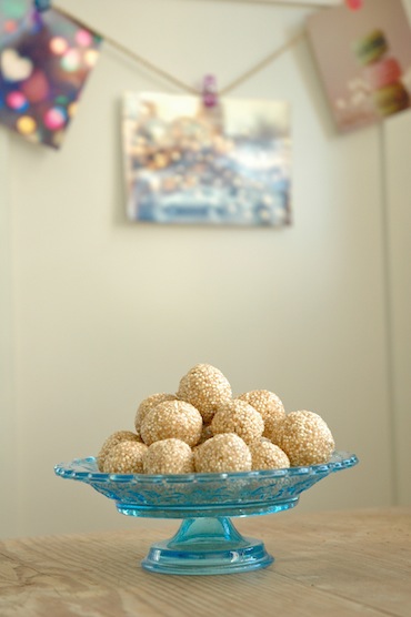 Combine all the ingredients and form small balls in your palm. Makes about 20 balls. Set in the fridge for at least 10 minutes before eating.