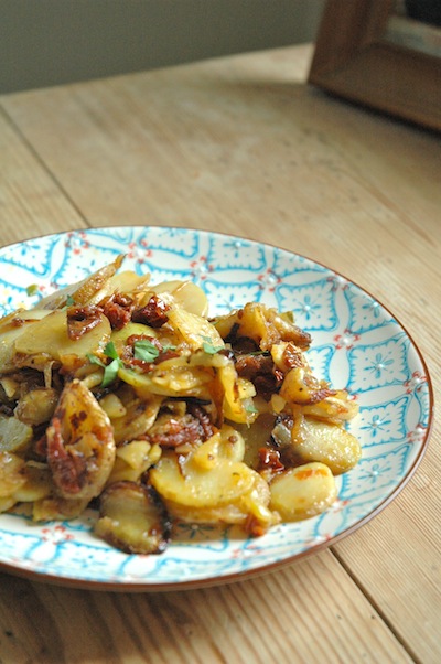 Cover the bottom of a large pan with olive oil (about 5-6 tbsp) and heat ip up. Add onion slices and potato slices. Keep the pan hot while stirring the potatoes often so they don’t get burnt. Eventually turn the heat down a bit. When the potatoes are golden, mix in salt and chopped dried tomatoes.