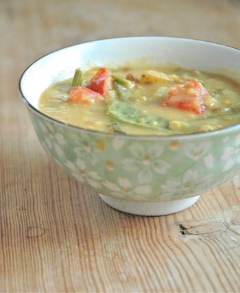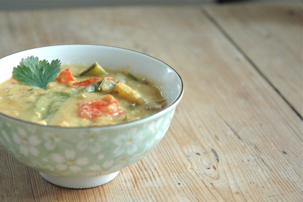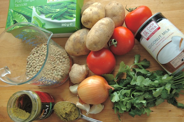 Heat oil in a large pot and add the onions. Let cook for 1-2 minutes and then add the garlic, ginger, green curry paste and curry powder. Let sit for a little while and maybe add a couple spoons of water so it doesn’t burn. Now add the vegetable stock, potatoes and lentils. Bring to boil and cook for about 15 minutes. Then add the rest of the ingredients (coconut milk, tomatoes, green snow peas, coriander, lime) and let simmer for another 15 minutes. Finally, add some salt to your taste.